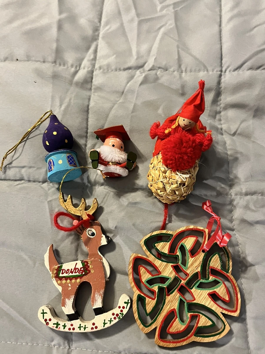 Vintage Wood Christmas Tree Ornaments Lot Mini Elf In Woven Shoe Reindeer Santa Ebay